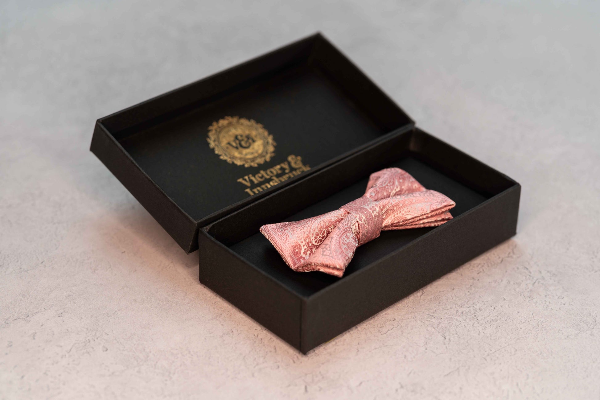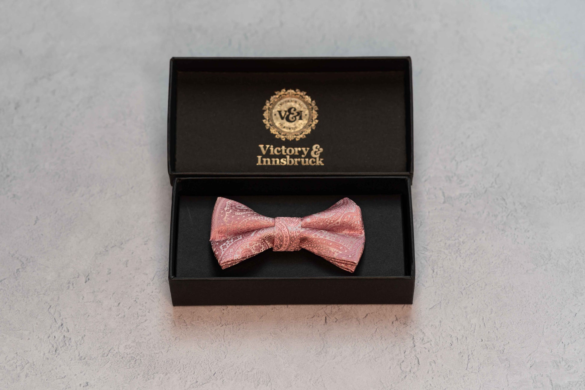 A paisley finish Victory & Innsbruck bow tie in a dusty pink colour. Ideal for any special occasion. Clip on fastening for ease and the guaranteed perfect finish.