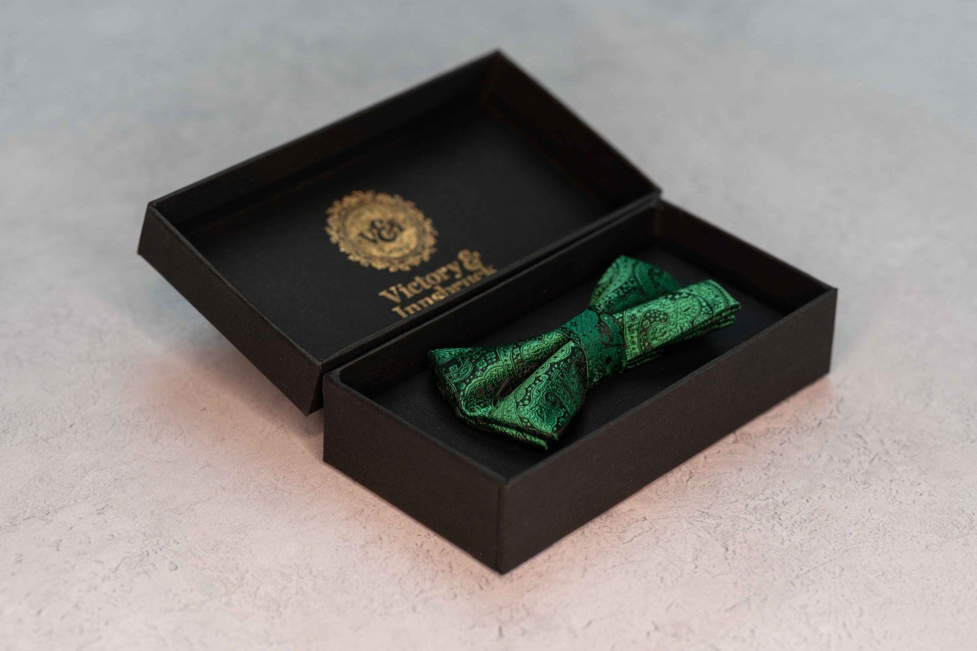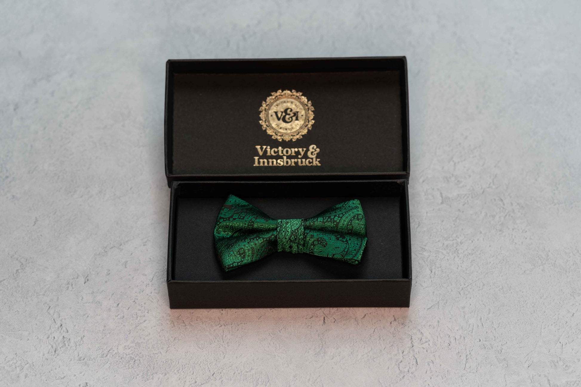 A paisley finish Victory & Innsbruck bow tie in a forest green colour. Ideal for any special occasion. Clip on fastening for ease and the guaranteed perfect finish.