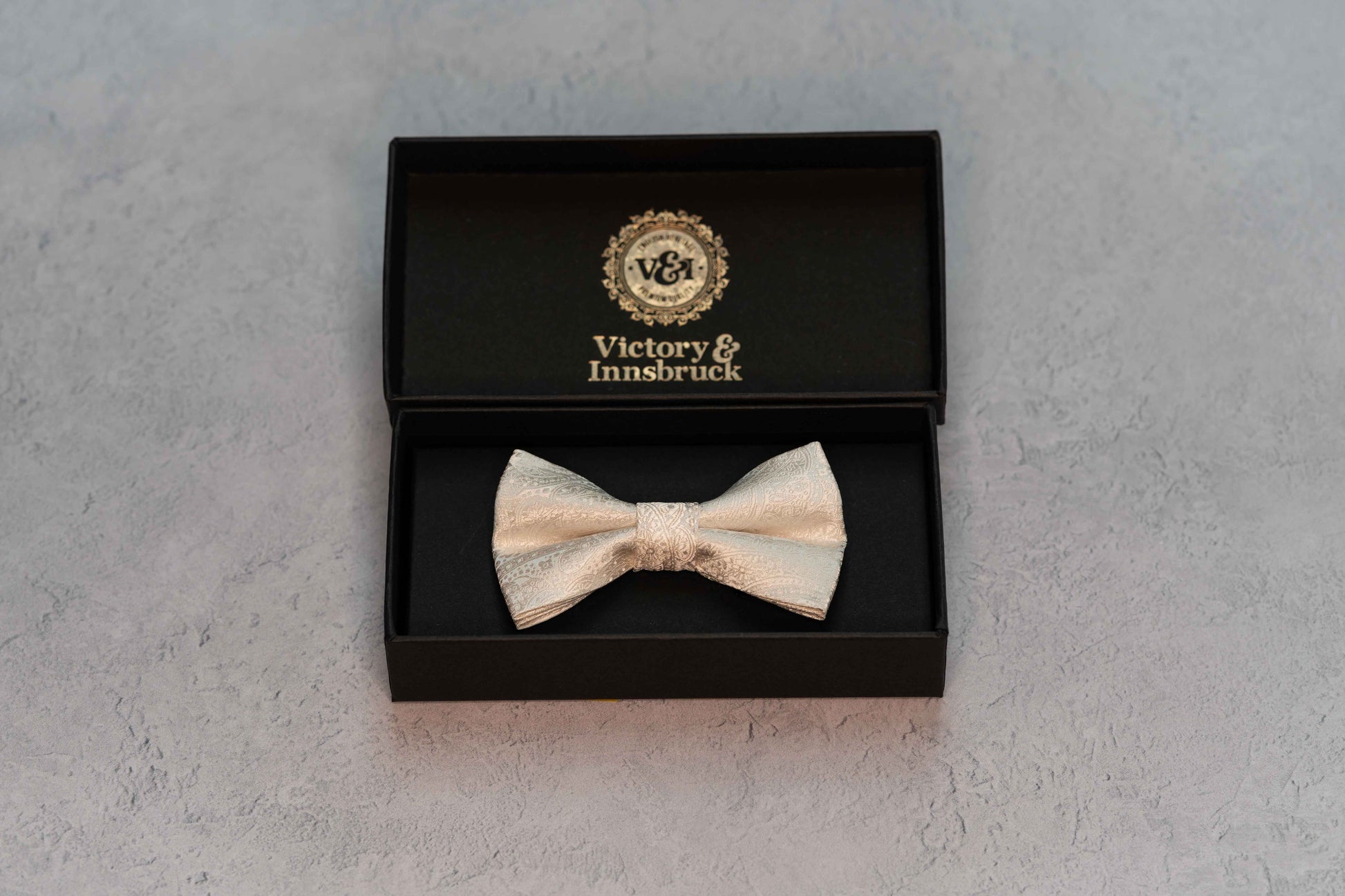 A paisley finish Victory & Innsbruck bow tie in a ivory colour. Ideal for any special occasion. Clip on fastening for ease and the guaranteed perfect finish.