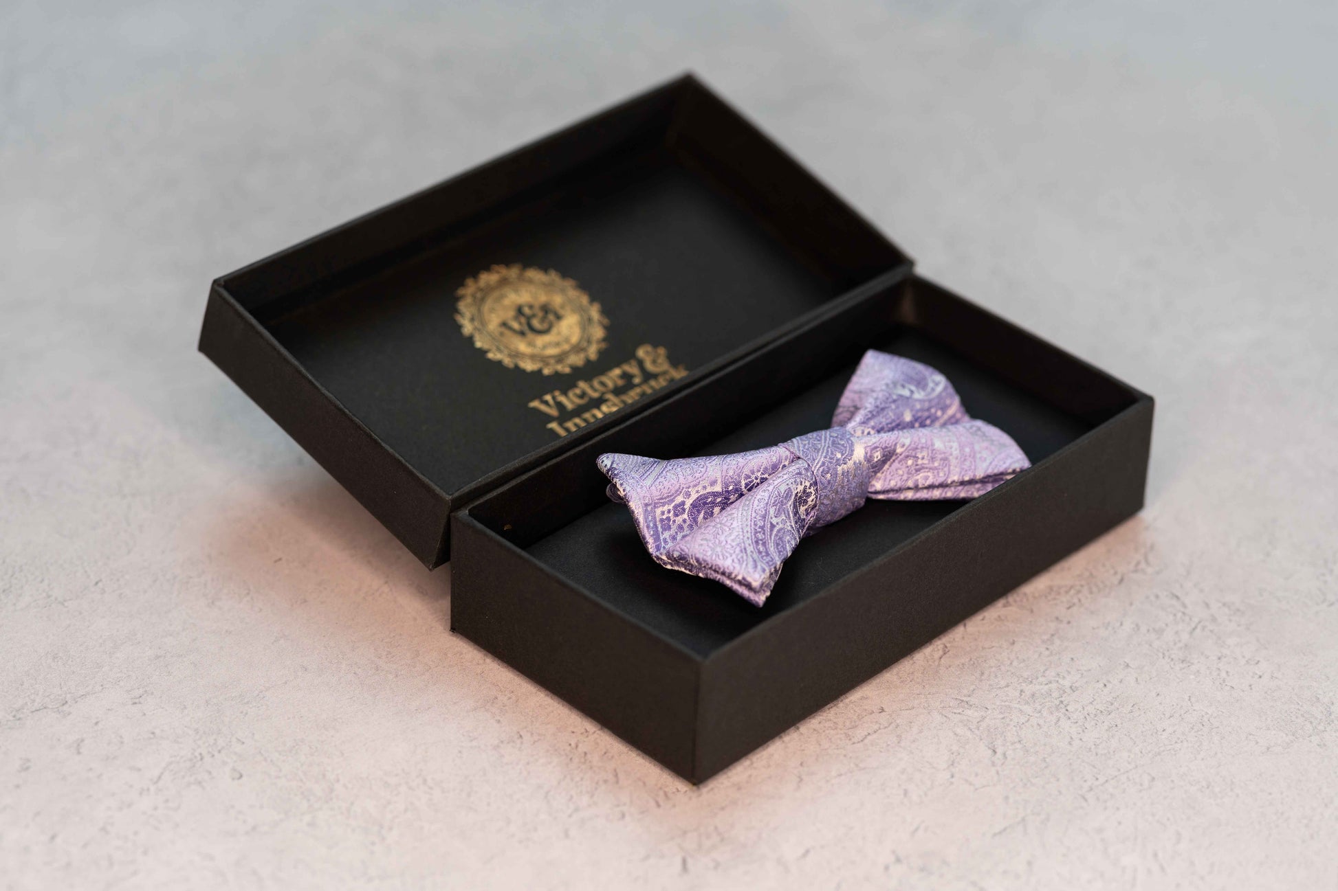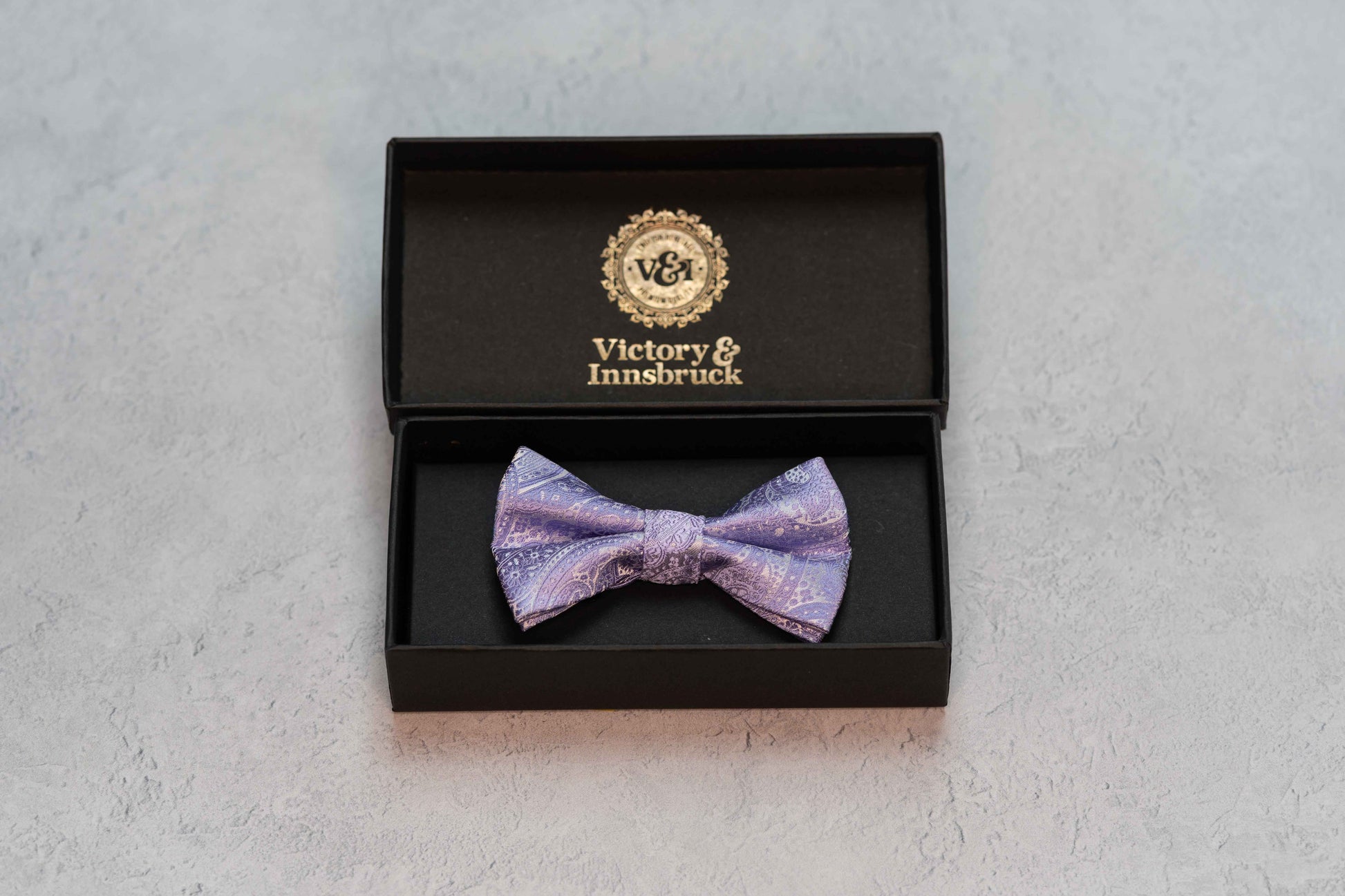 A paisley finish Victory & Innsbruck bow tie in a lavender colour. Ideal for any special occasion. Clip on fastening for ease and the guaranteed perfect finish.