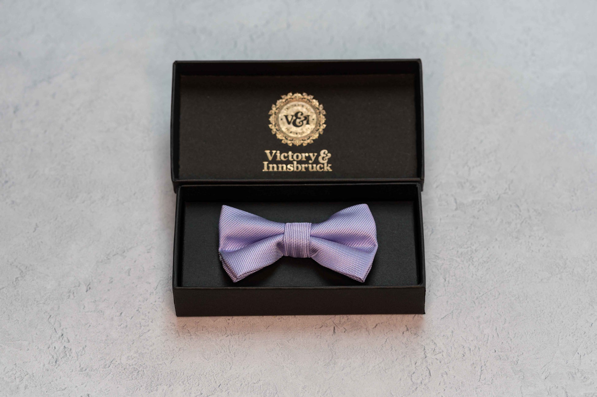 A textured finish Victory & Innsbruck bow tie in a lavender colour. Ideal for any special occasion. Clip on fastening for ease and the guaranteed perfect finish.