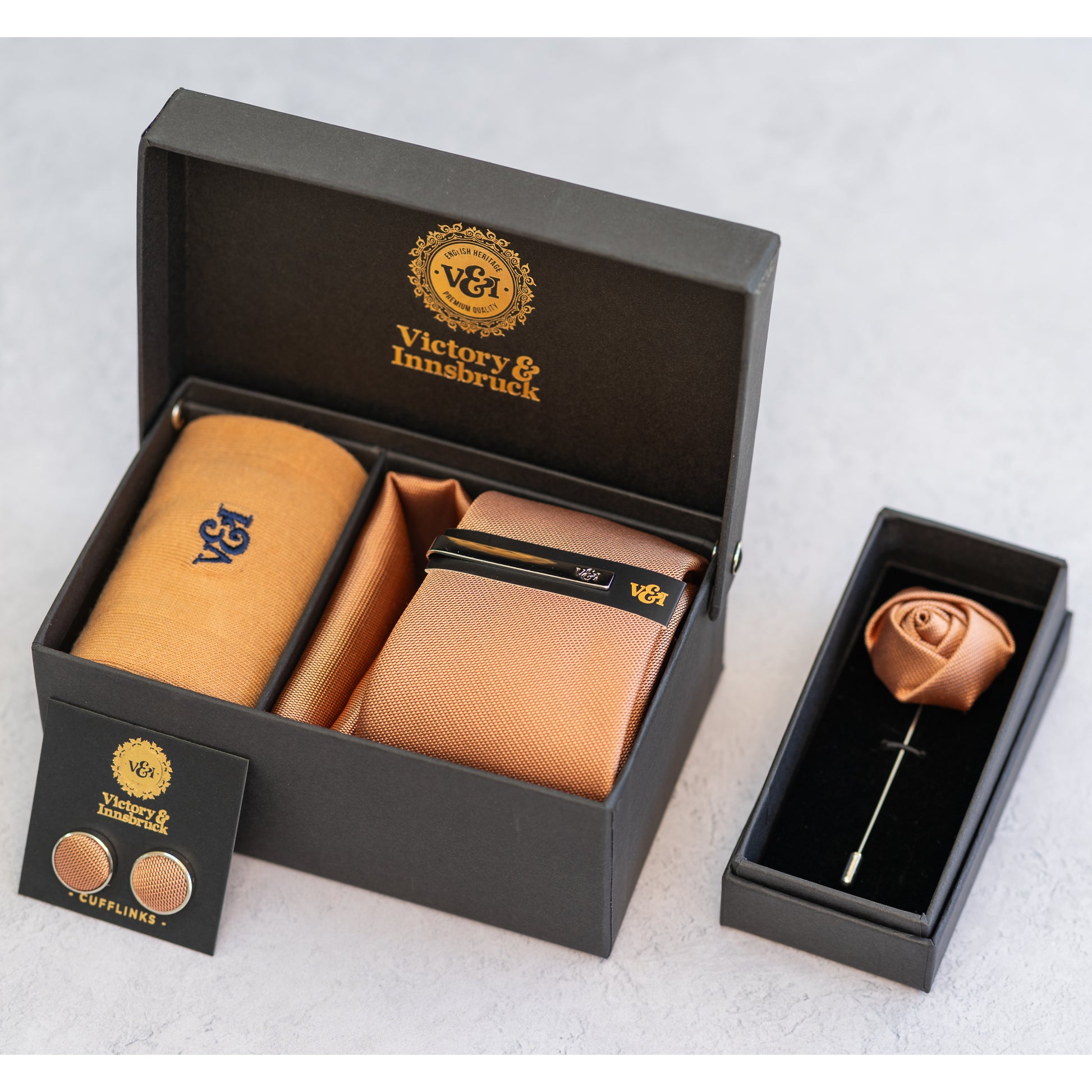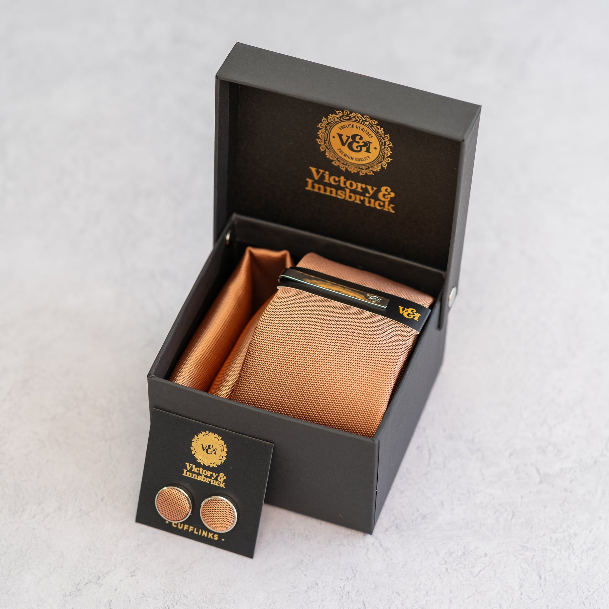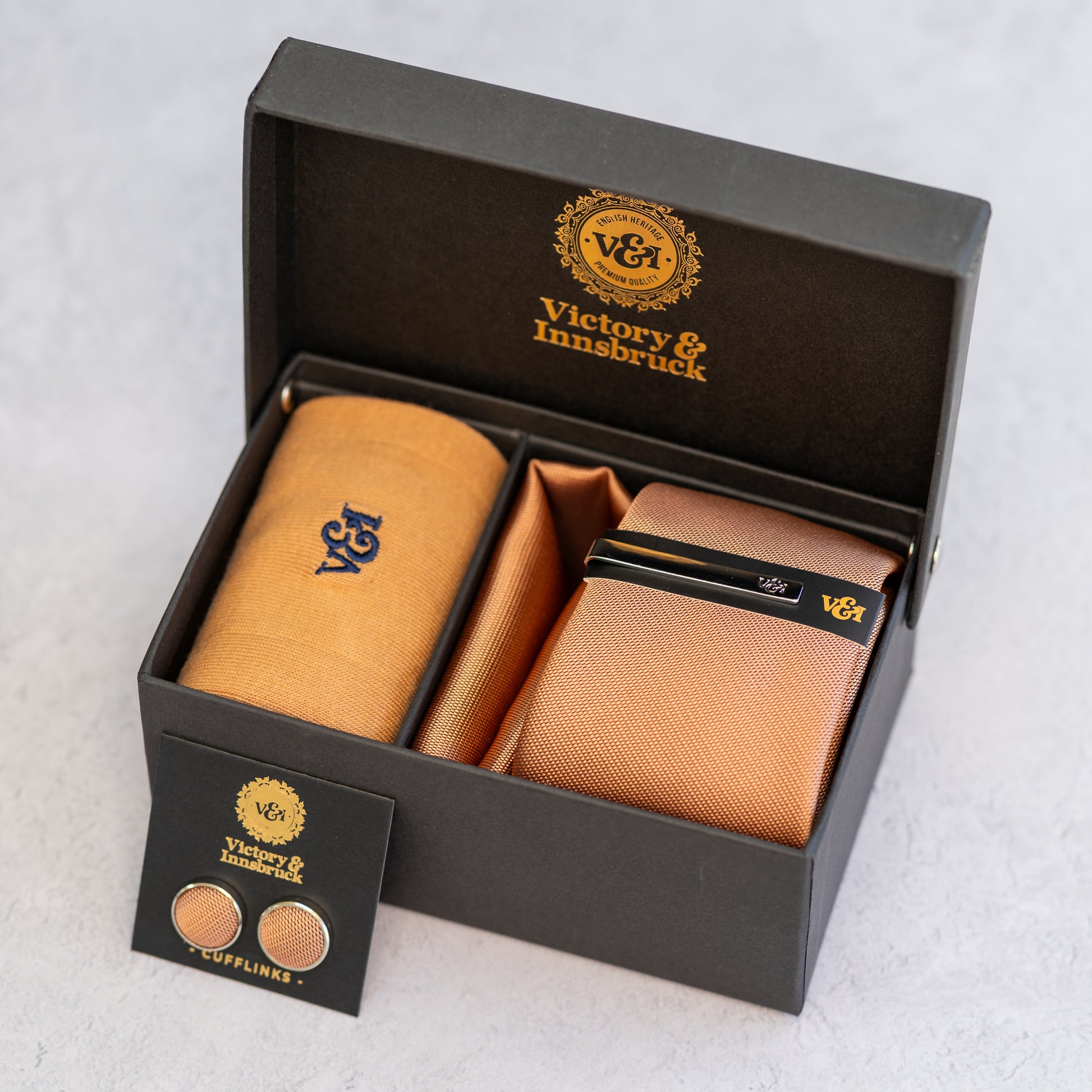 - Box Set (No Socks) - A smaller version of our full box set without the Socks. Includes Tie, Tie Bar, Pocket Square & Cufflinks.