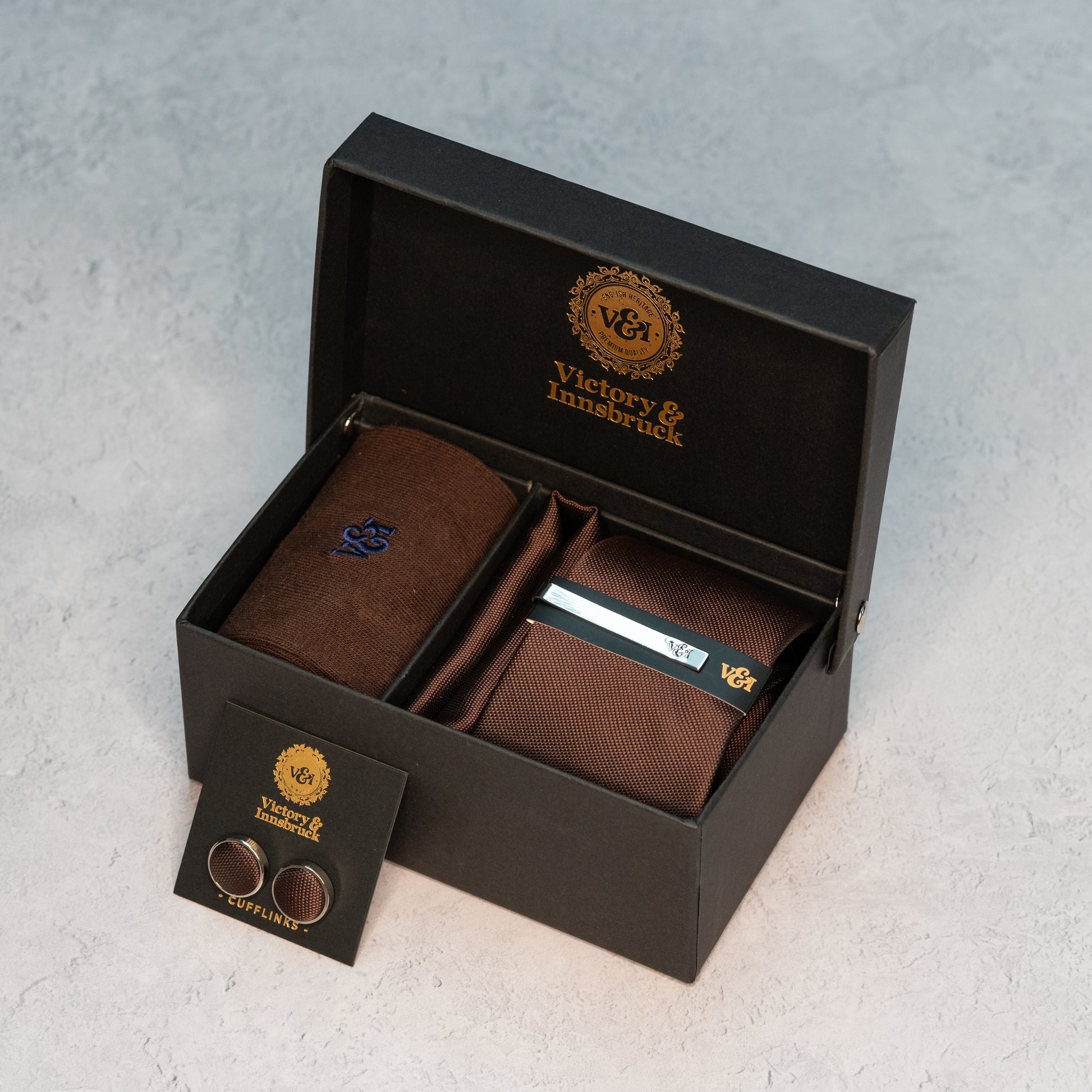 - Full Box Set - Tie, Tie Bar, Pocket Square, Cufflinks and Socks in our signature V&I gift box.