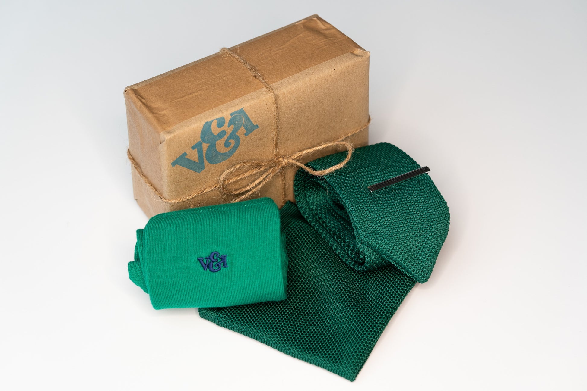 - Full Box Set - Tie, Tie Bar, Pocket Square and Socks in our signature V&I gift box.