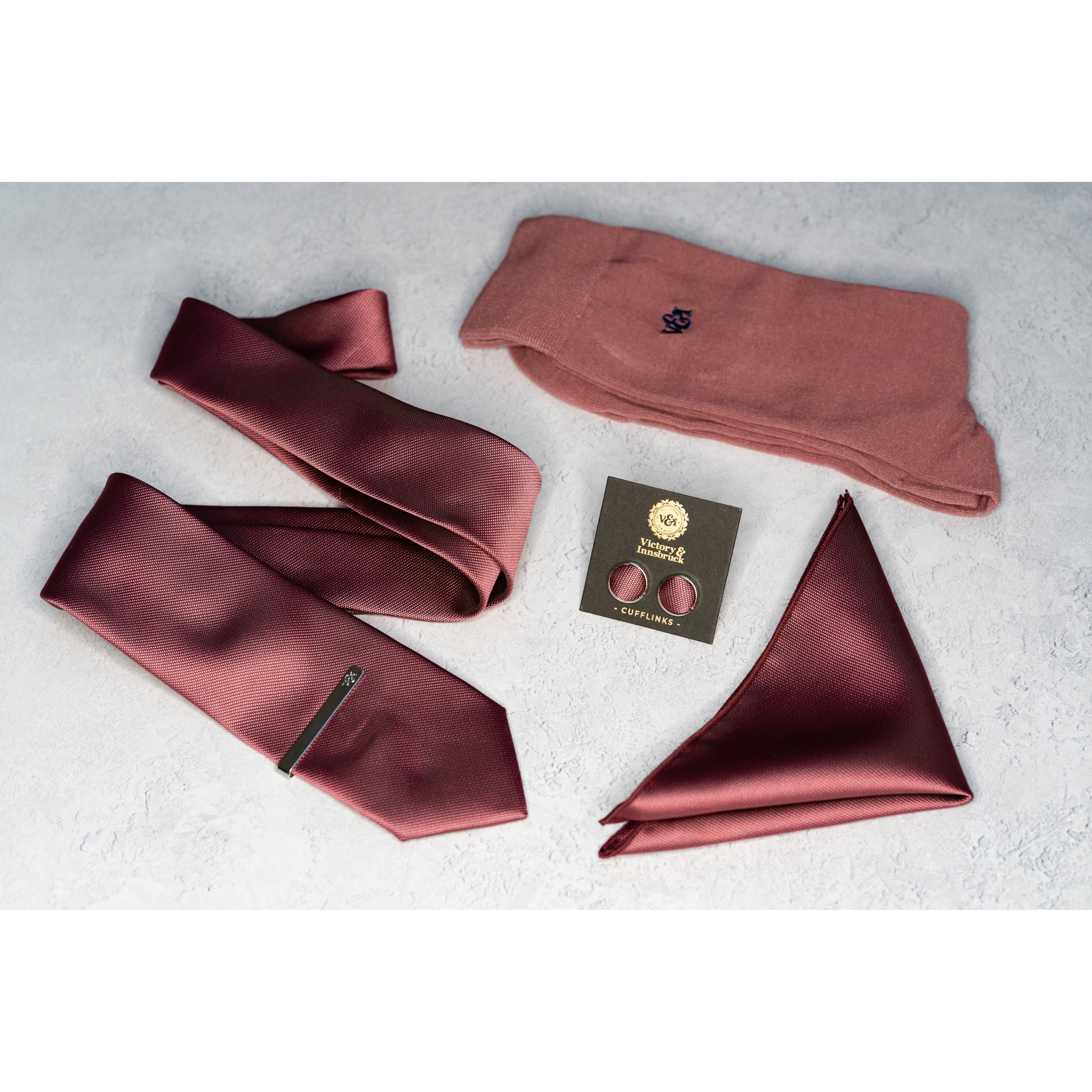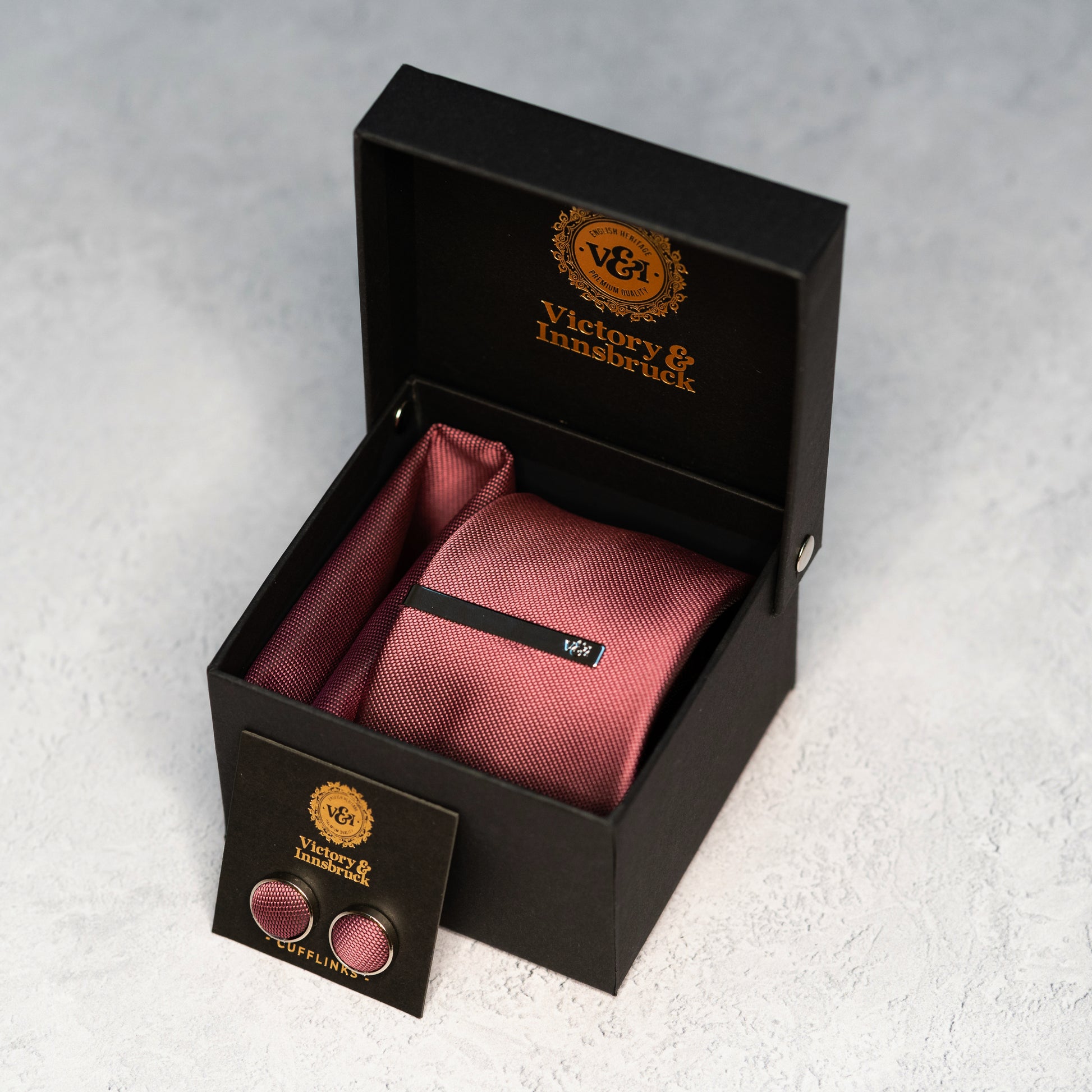 - Full Box Set - Tie, Tie Bar, Pocket Square, Cufflinks and Socks in our signature V&I gift box.