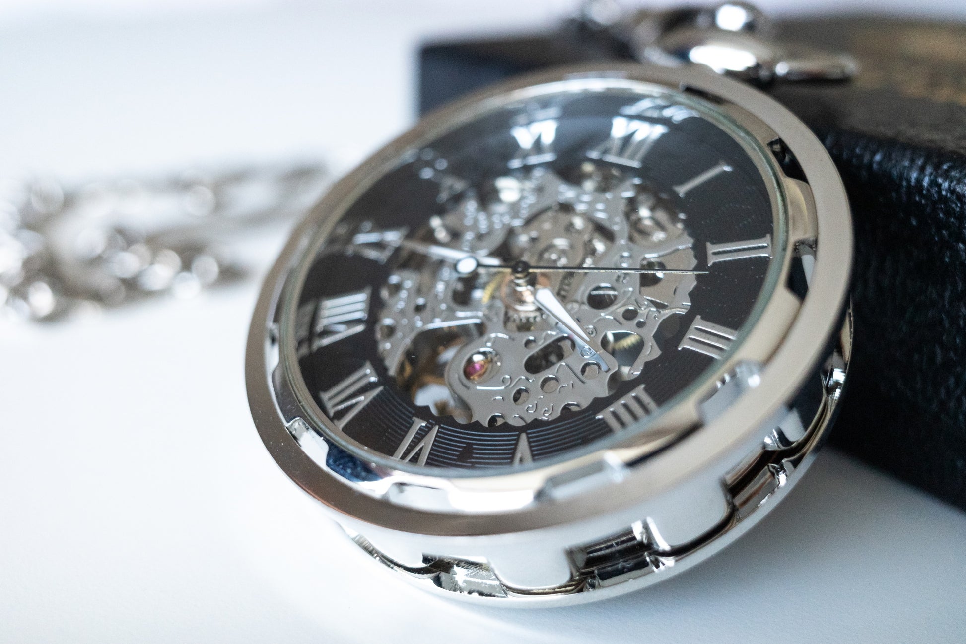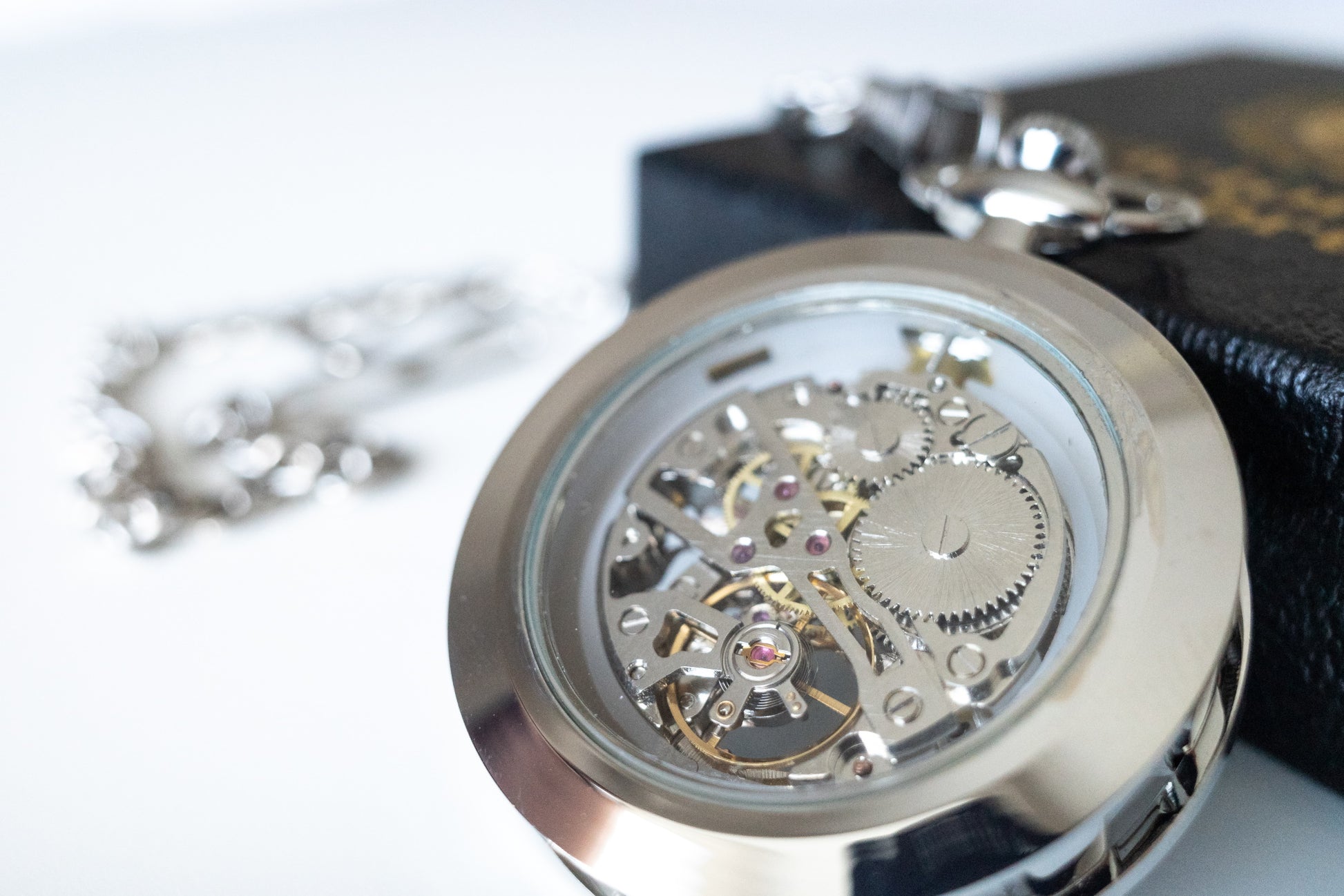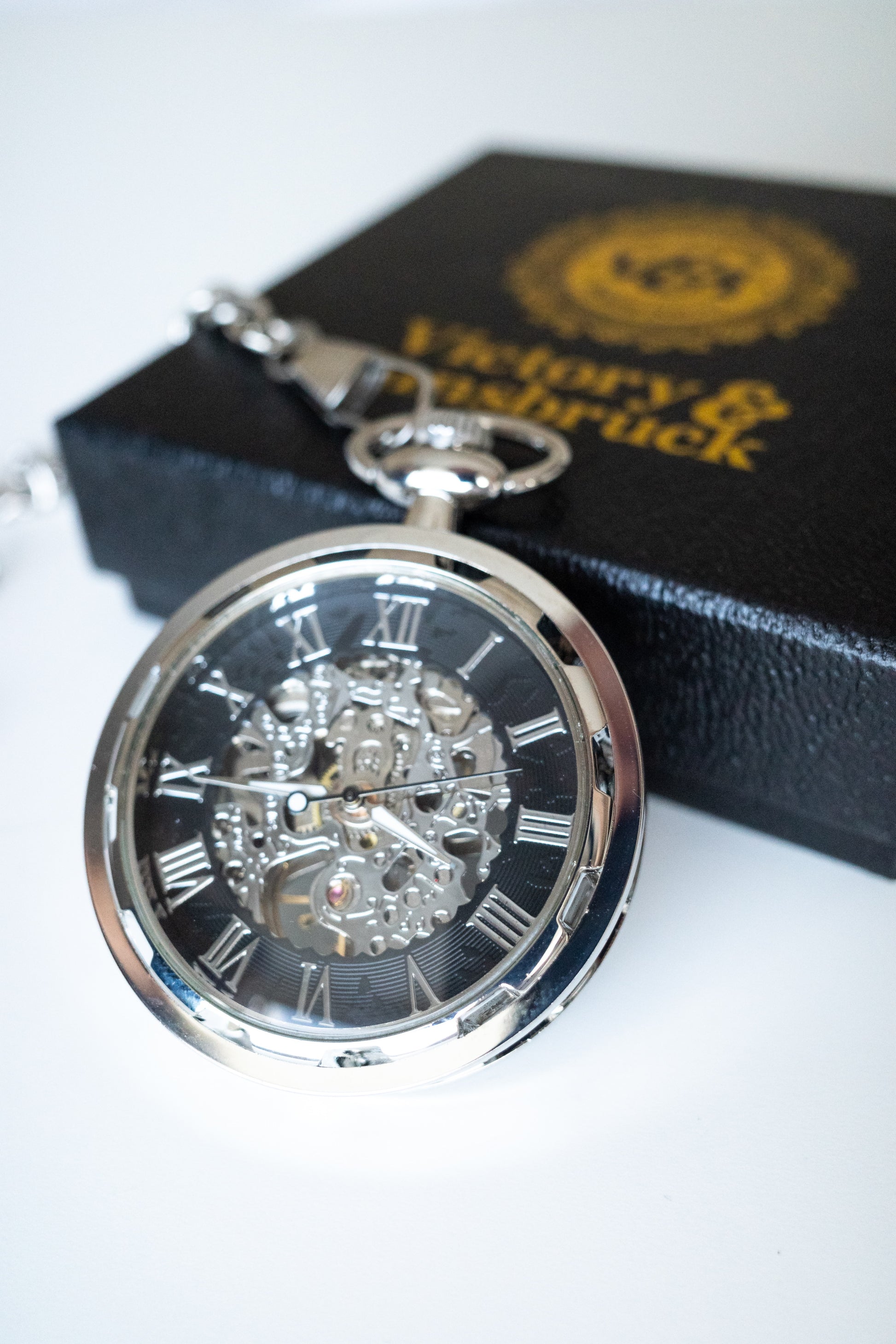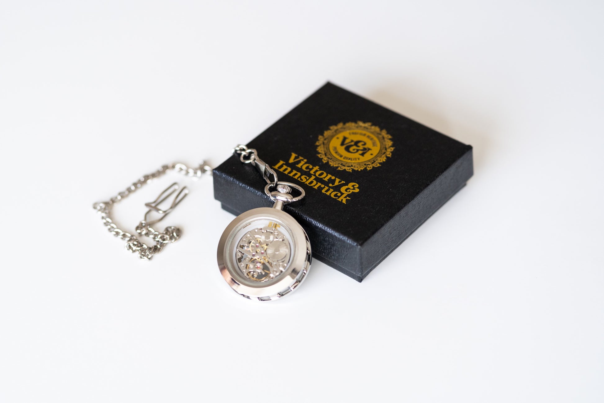 A strong and unassuming pocket watch. Featuring a detailed silver mechanism visible from both the front and rear and a black clock face with silver roman numerals, encased in a silver surround with matching chain link.