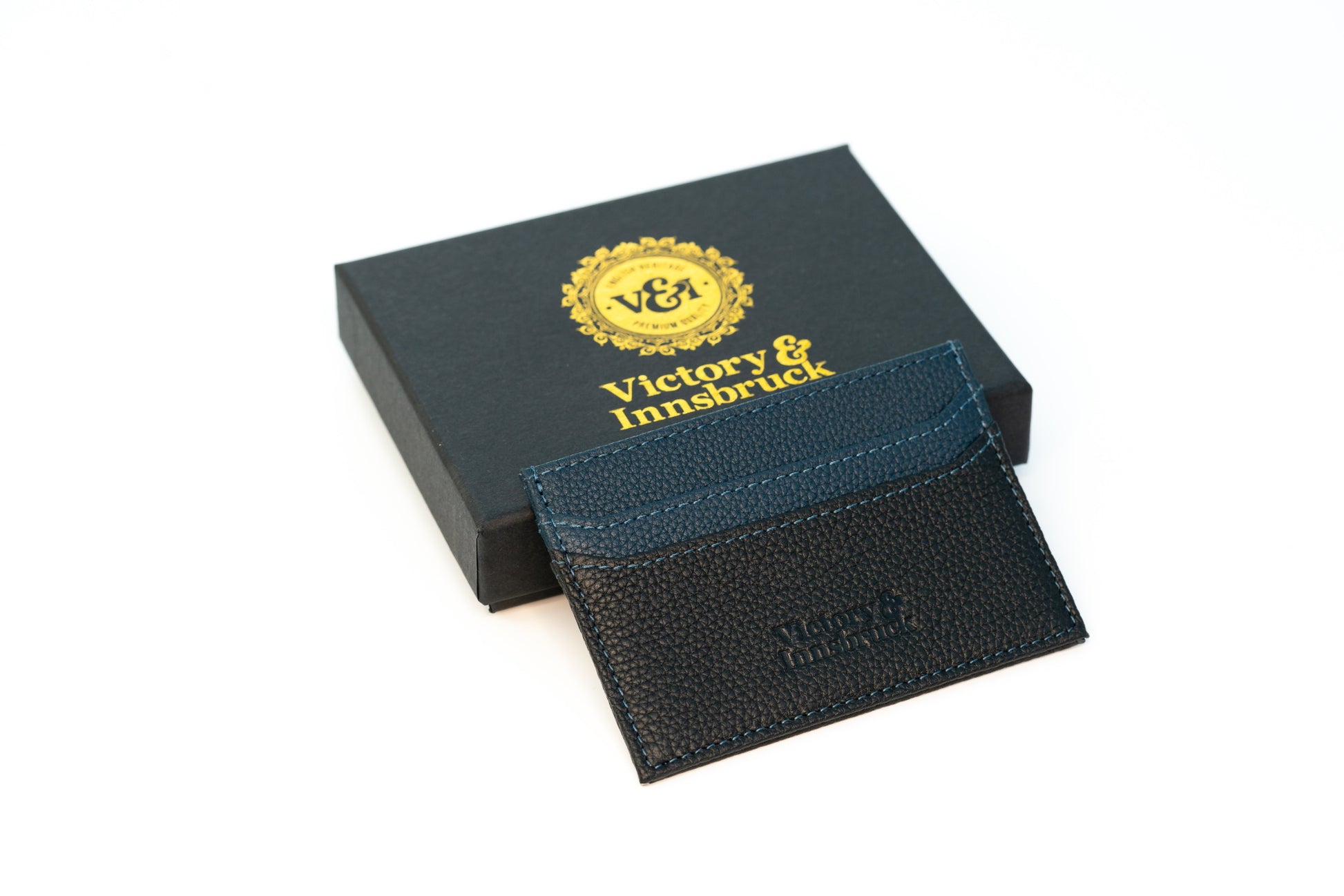 The Black & Navy Card Holder is full-grain leather regarded as the highest quality. A strong and durable form of leather which has not been sanded or buffed. This means it displays the natural characteristics of leather.