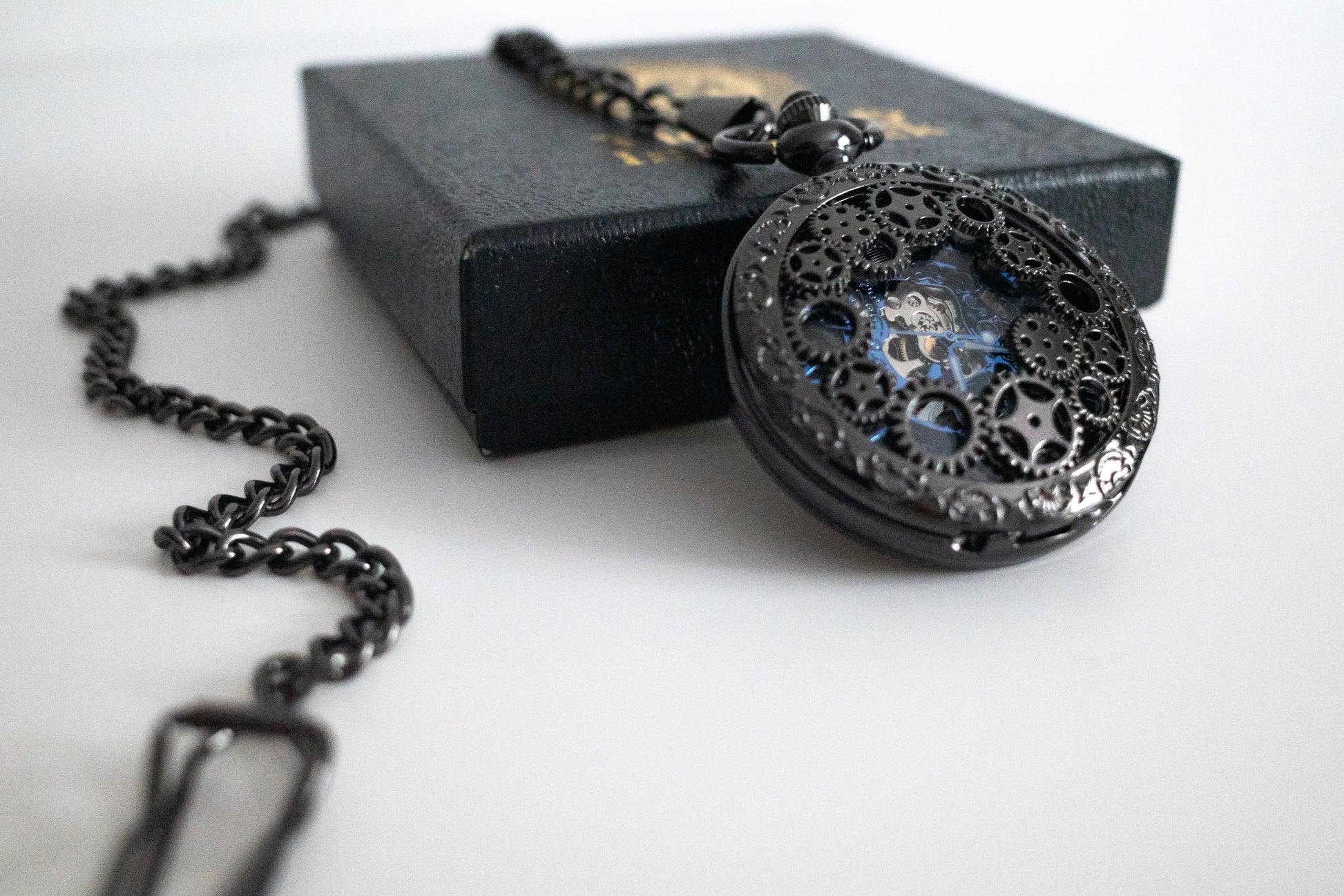 For the bold, featuring a stand out blue and silver mechanism visible from both the front and rear encased in a gunmetal black cog design case. A black clock face with blue roman numerals and gunmetal chain link.